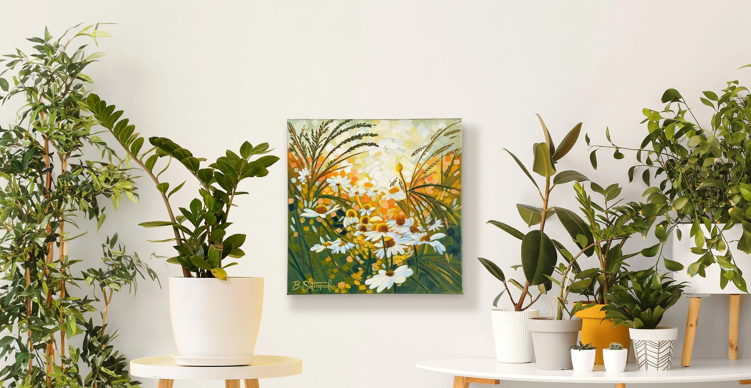 My paintings are rooted in observation and intuition: gardens, walks, seasons of growth, and the simple grounding beauty of being present. I believe art isn’t just something you hang — it’s something you live with.